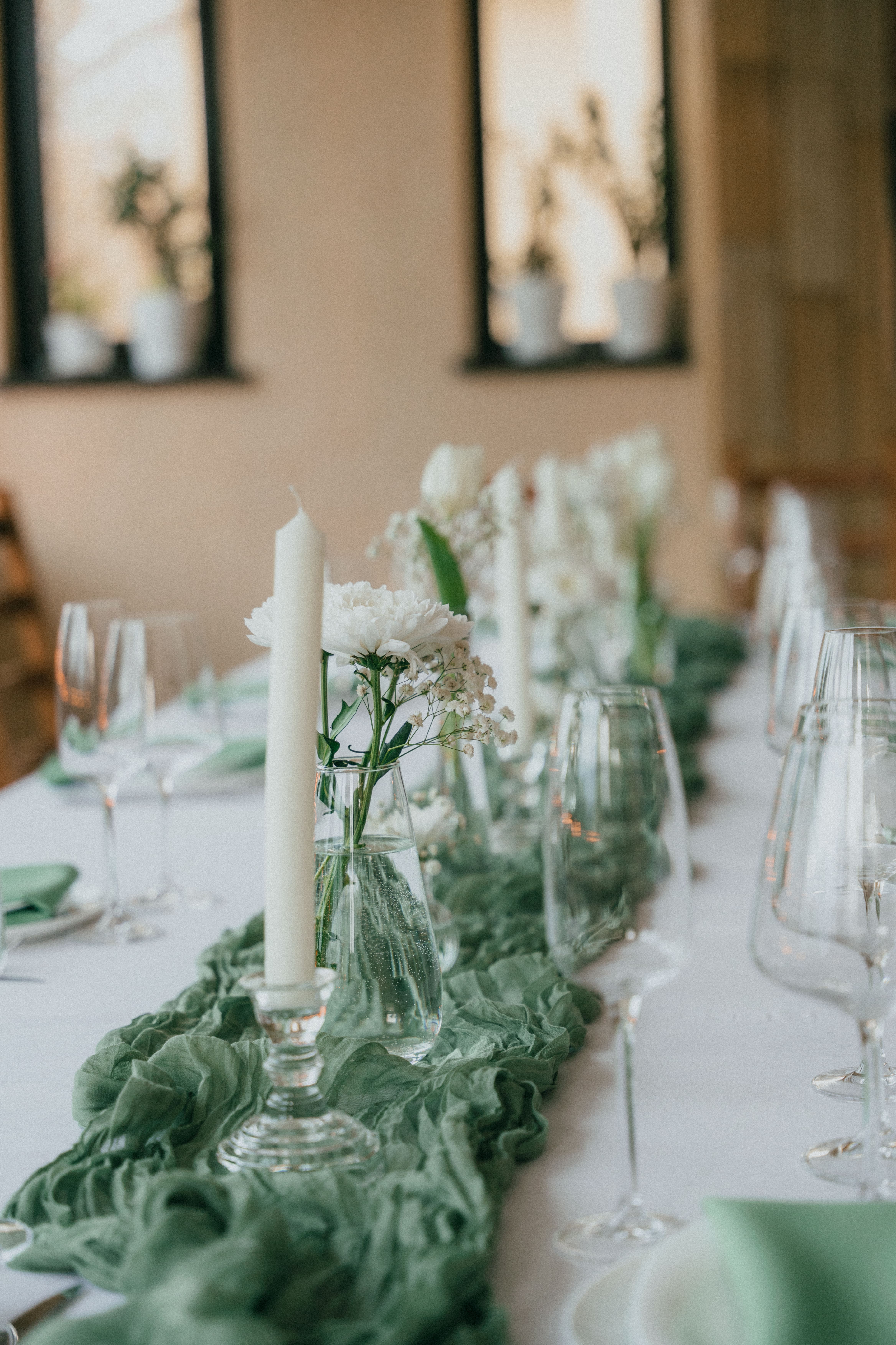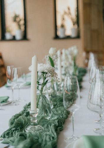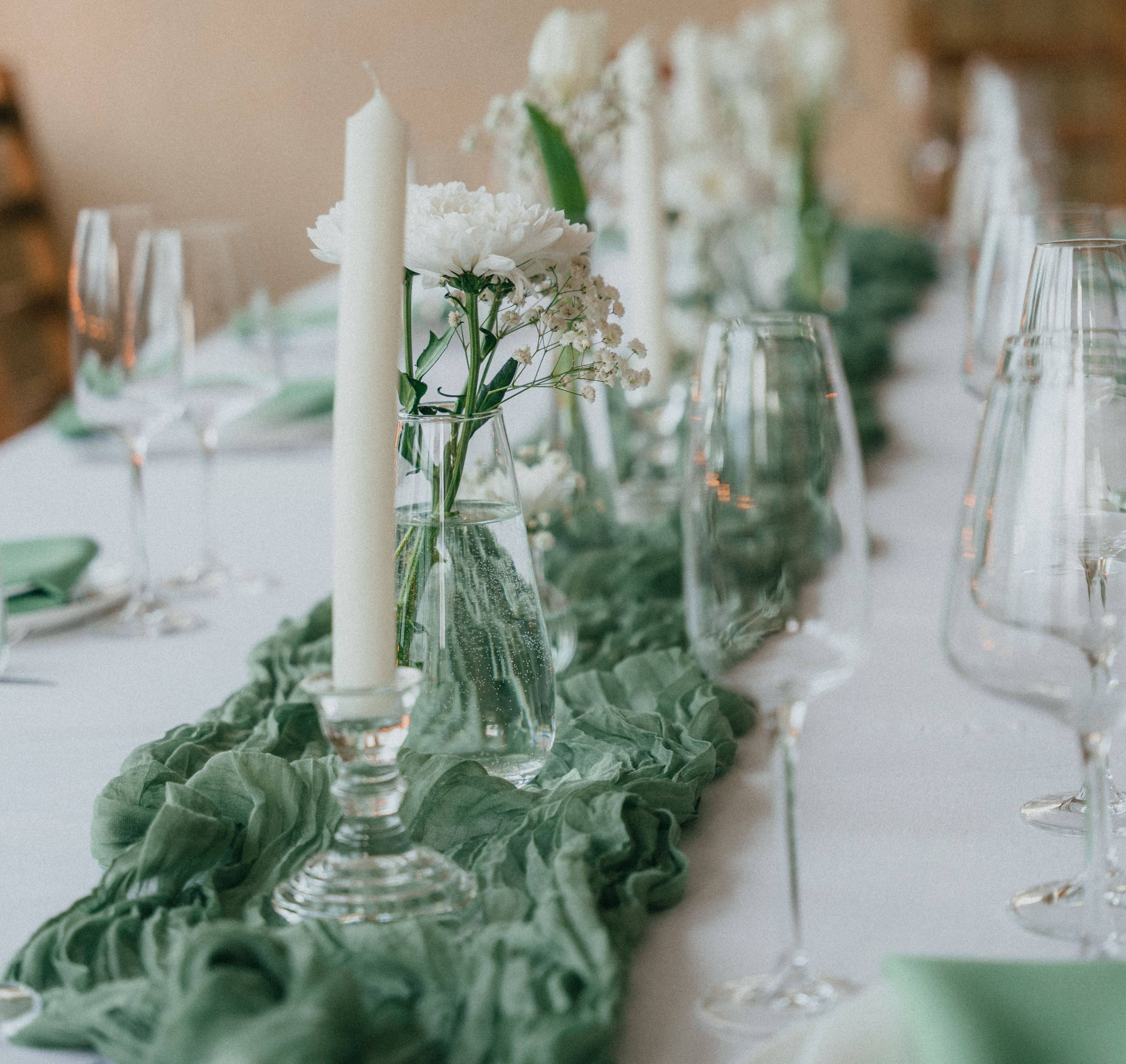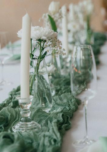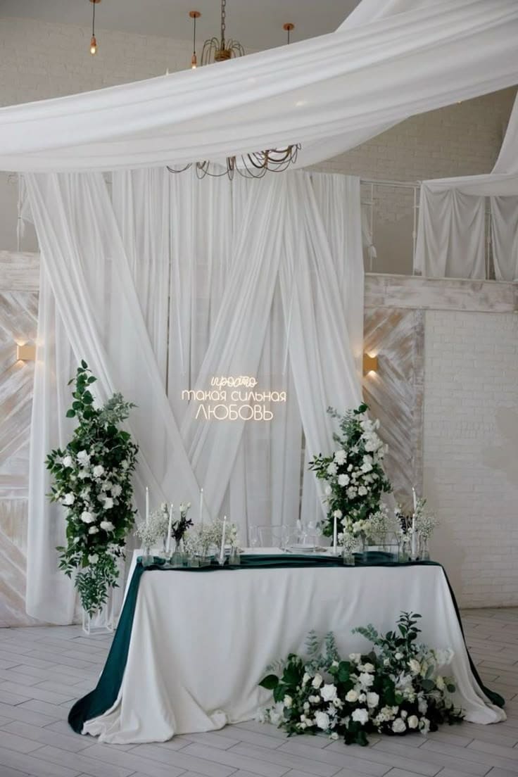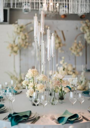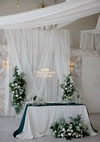 - Оформление гостевых столов, на выбор (невысокие композиции с живой флористикой, тканевые салфетки в качестве акцента или высокие композиции на стол)
